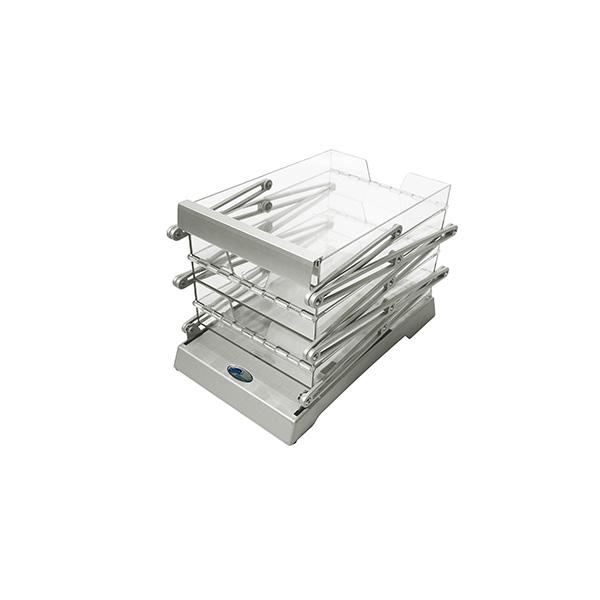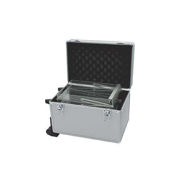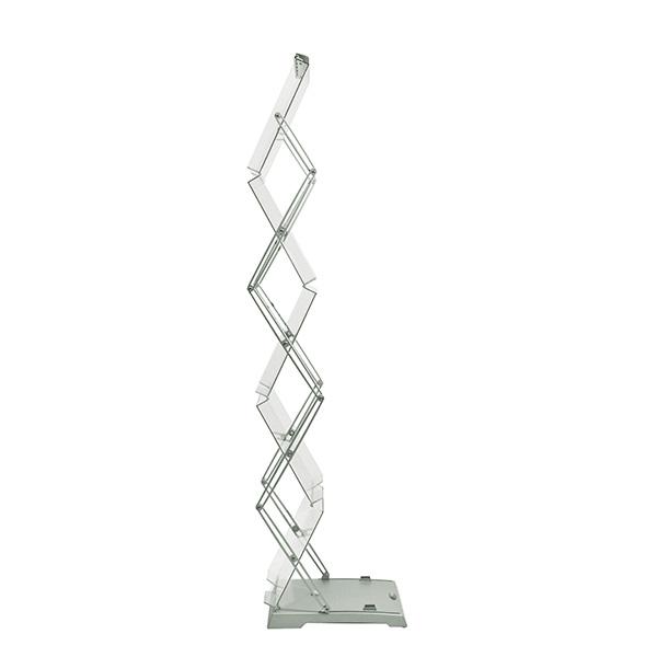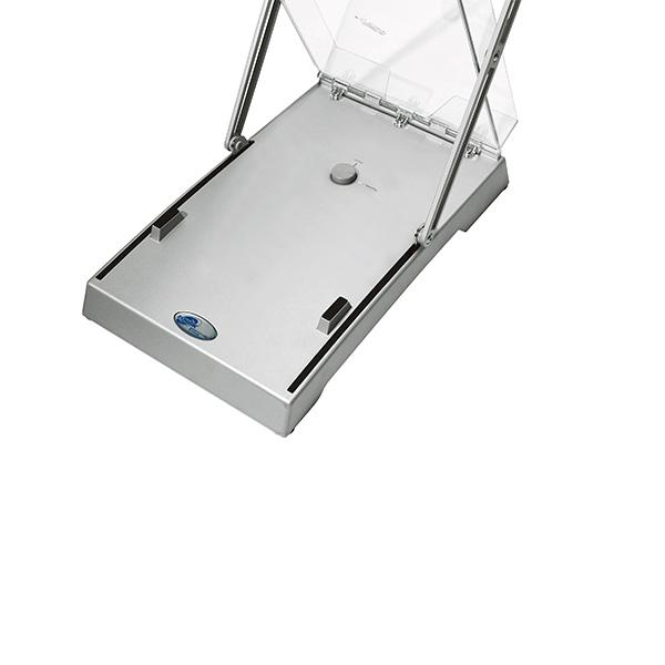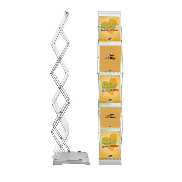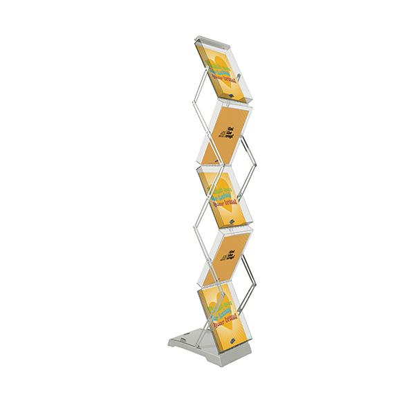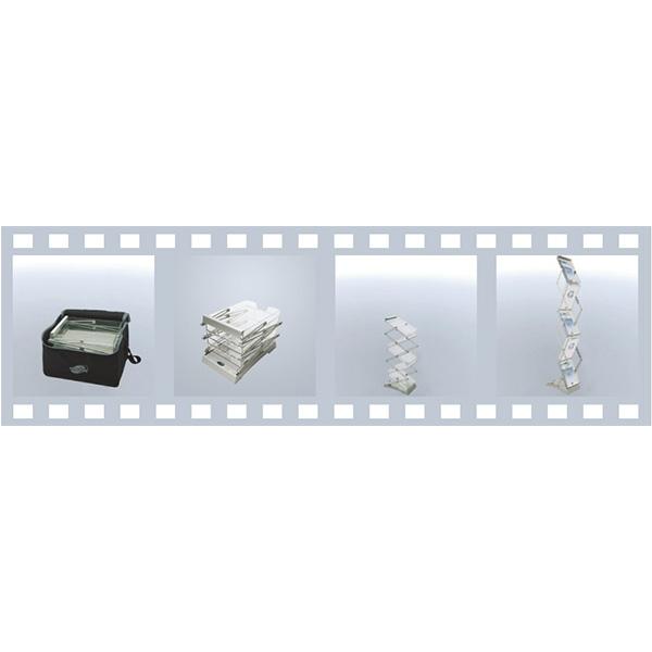 Brochure Stand Double permite exponer sus folletos en dos lados gracias a su construcción en zigzag. El expositor de folletos se pliega al tomarlo de la parte superior para colocarlo en posición vertical. Ofrece una construcción fina y estable. El botón de bloqueo refuerza la seguridad del sistema cuando está desplegado. Disponible con estuche de transporte suave o duro.