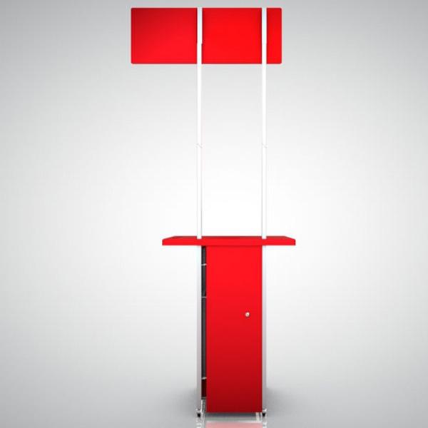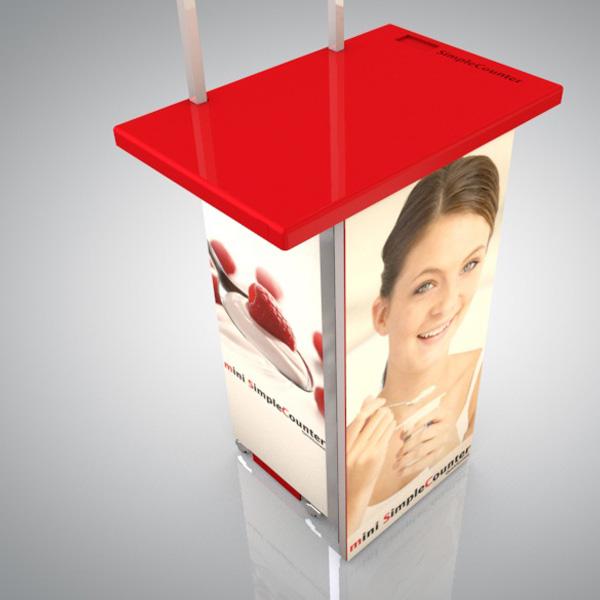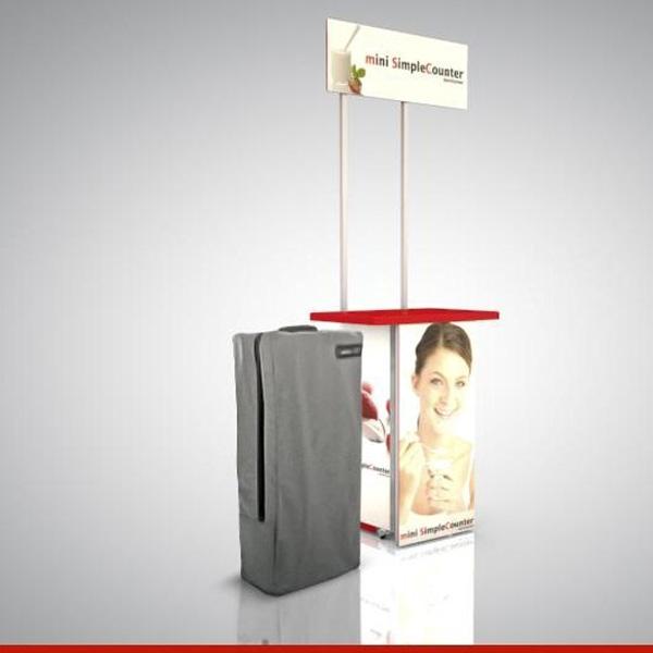 El minisimple counter el pequeño gigante de los stands portátiles en el mundo, es la mejor solución, ya que en el mismo modulo se encuentran ruedas y puertas, asi como una mesa de trabajo, 2 repisas internas y un gran copete para promocionar su marca, independientemente del area grafica del mismo stand en frente y laterales.