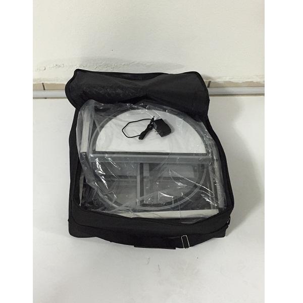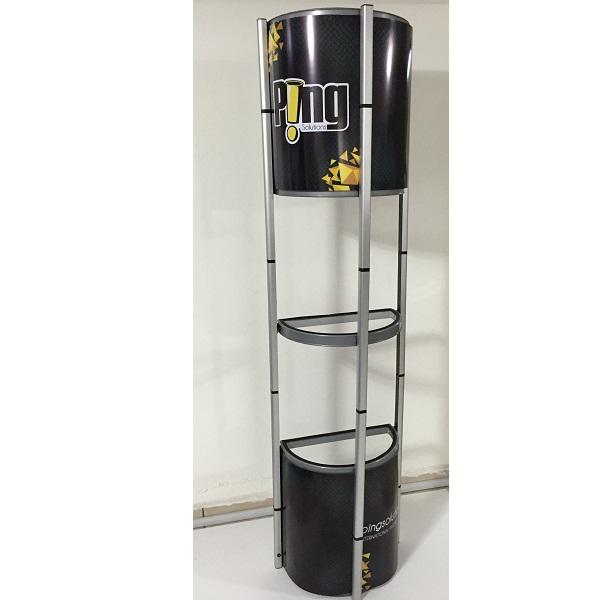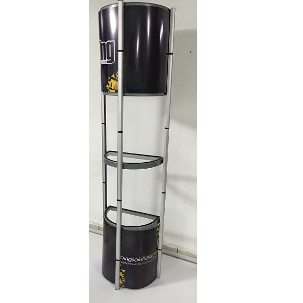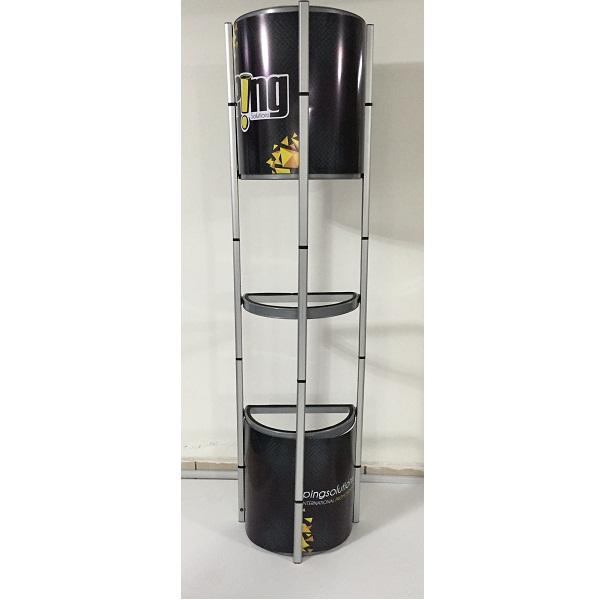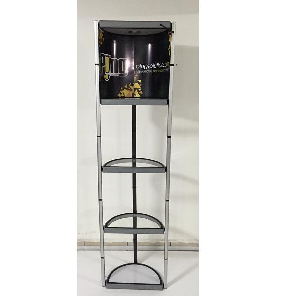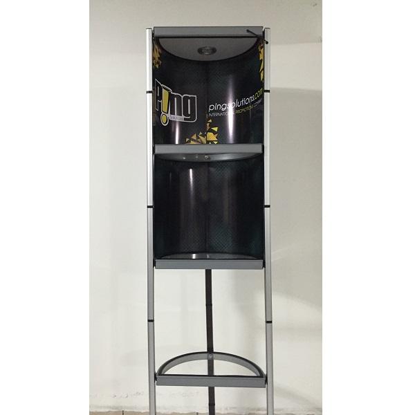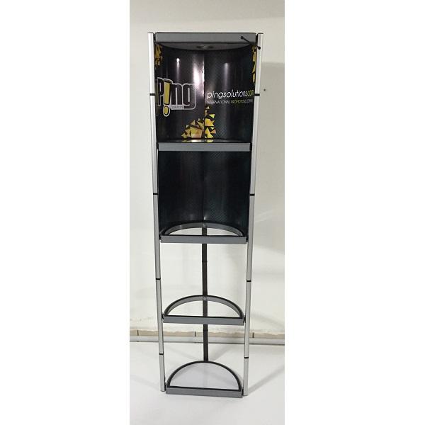 Exhibidor portáil, marco de aluminio con 8 láminas de pet transparente que se sujetan con imán para gráficos o protejer productos, cuanta con luz led en la parte superior, montaje sin herraienta