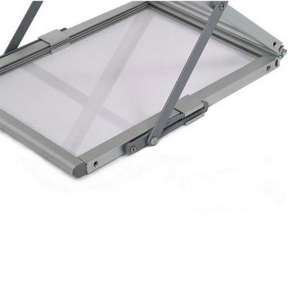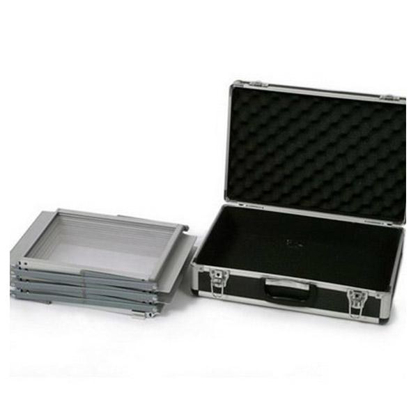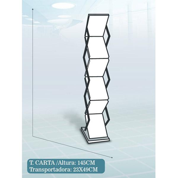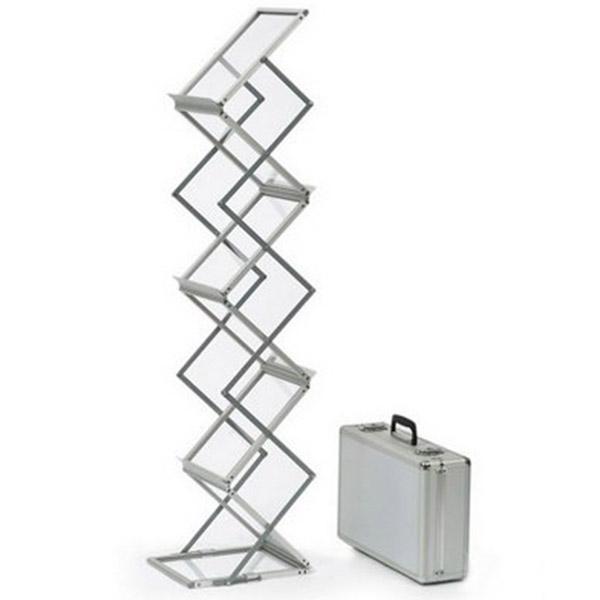 Características:Estructura plegable de aluminio natural perfectamente terminado, 6 racks o espacios de folletos a presentar, maletín transportador del equipo de aluminio natural y protección interior para el equipo.